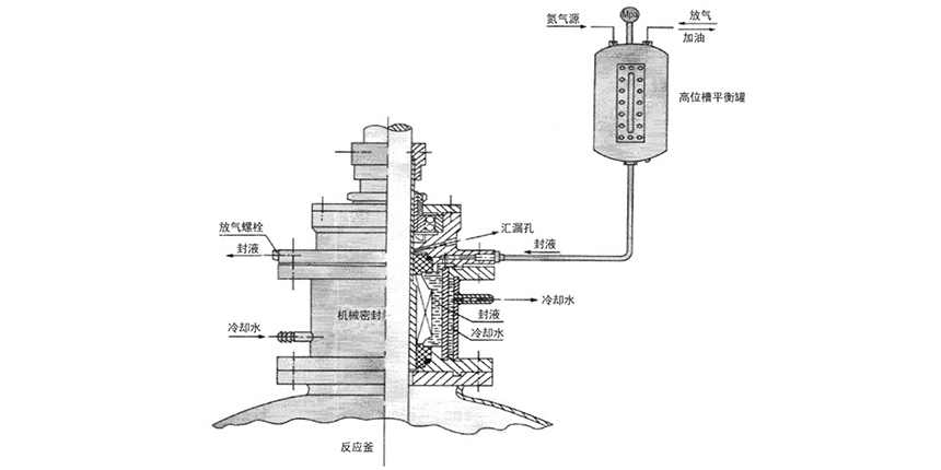 (2)該裝置多在負(fù)壓情況下配用,也可用在正壓工況,負(fù)壓時(shí)高位槽可不用通氣源,正壓時(shí)高位槽接通氣源,調(diào)整好壓力使高位糟及密封腔壓力與釜內(nèi)壓力處于相等或高于釜內(nèi)工作壓力0.05-0.1MPa為好。